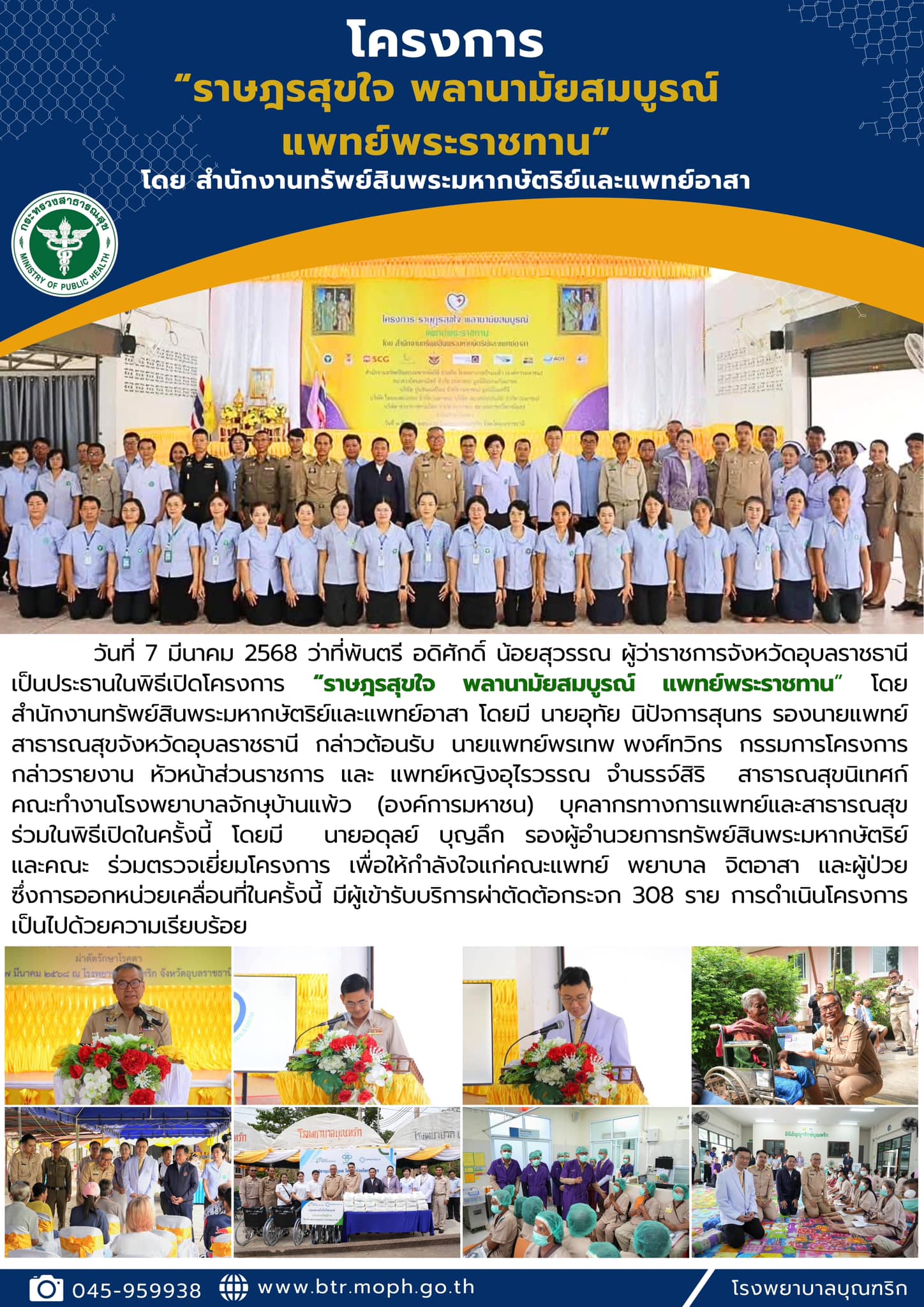 โครงการ “ราษฎรสุขใจ พลานามัยสมบูรณ์ แพทย์พระราชทาน” ครั้งที่ 4 ประจำปี 2568 ณ โรงพยาบาลบุณฑริก อำเภอบุณฑริก จังหวัดอุบลราชธานี