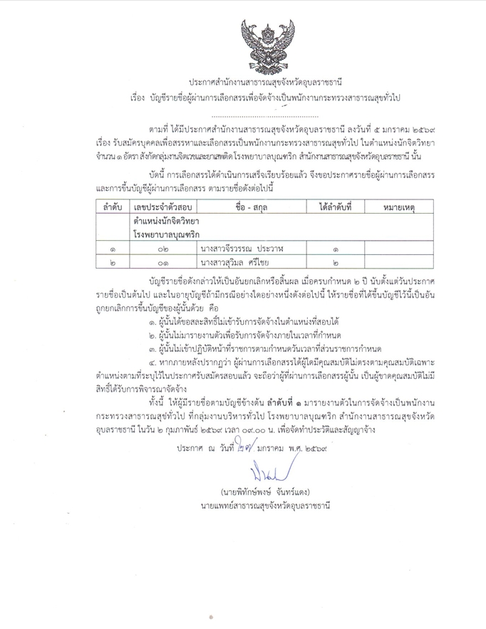 ประกาศ เรื่อง บัญชีรายชื่อผู้ผ่านการคัดเลือกสรรหาเพื่อจัดจ้างป็นพนักงานกระทรวงสาธารณสุขทั่วไป